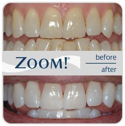 We use the Zoom light-activated whitening system to achieve beautiful results in just one office visit. The active ingredient in Zoom whitening gel is hydrogen peroxide. Throughout the process, the peroxide gel breaks down, allowing oxygen to penetrate the dental enamel and bleach stains without affecting the structure of your tooth. The Zoom light helps activate the peroxide, allowing it to penetrate the surface of the tooth.